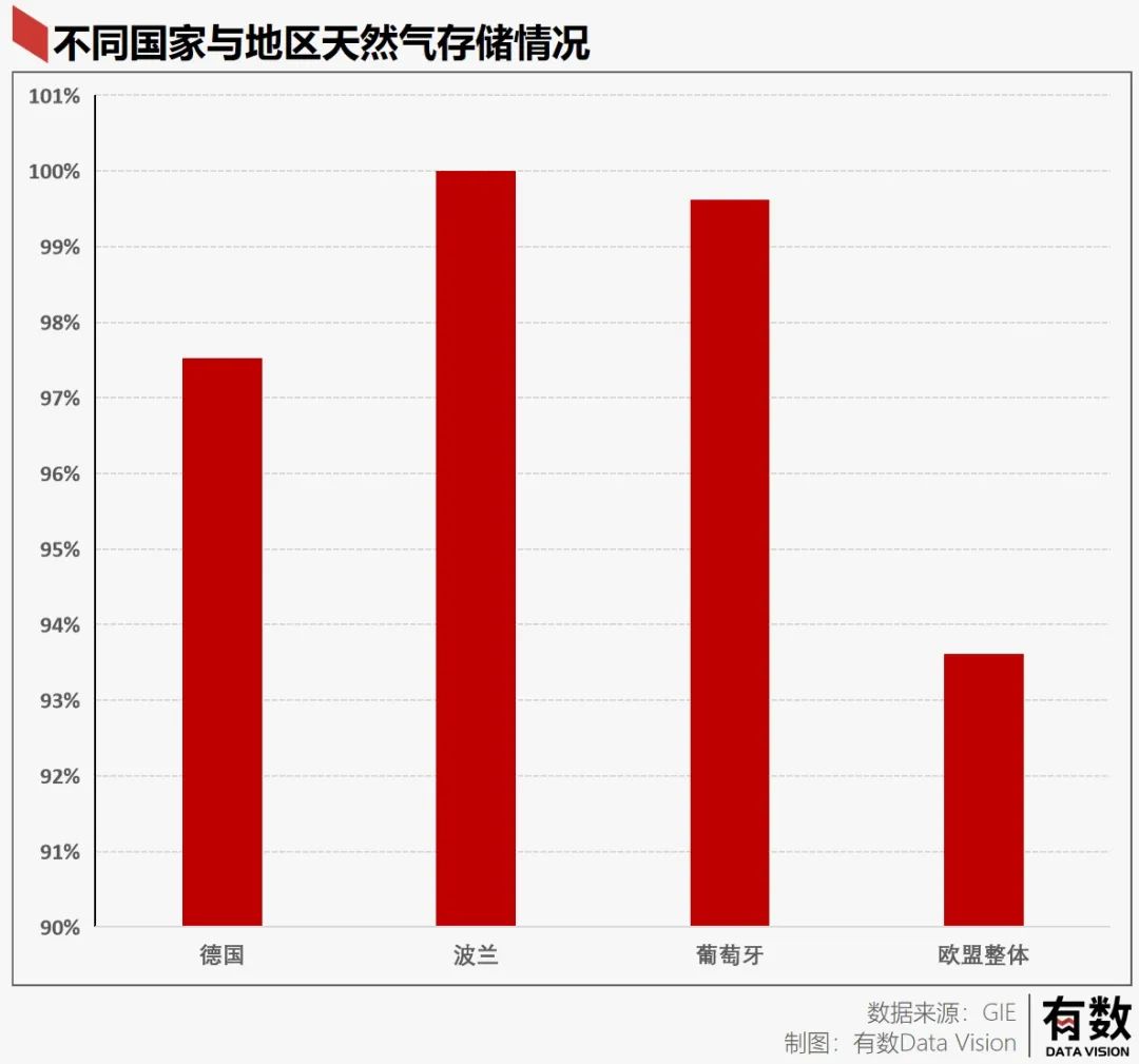 根据GIE数据显示,早在今年8月28日,波兰,葡萄牙的天然气仓储量就高达100%与99.62%,仅有意大利,奥地利等几个小型国家并未达到80%的及格线。截至10月24日,欧盟整体天然气储气率为93.61%,而德国天然气储存率已经达到97.53%。