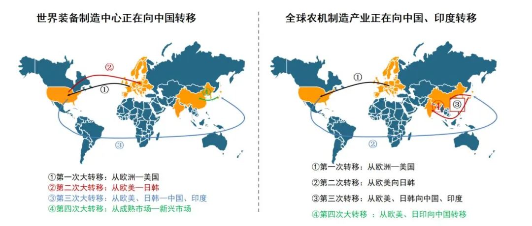 18世纪中叶出现了“第一次工业革命”,在这个过程中以蒸汽机为动力的拖拉机、联合收获机等农机出现,当然这些事情都发生在以英国为主的欧洲地区,19世纪随着美国西部大开发,欧洲农机制造重心向北美转移,这是第一次转移;二战之后欧洲、北美的农机制造业向日本和韩国转移,这是第二次转移;20世纪80年代之后中国改革开放,全球的农机产业,尤其是欧美和日韩集体向中国和印度等国家转移,这是第三次转移。