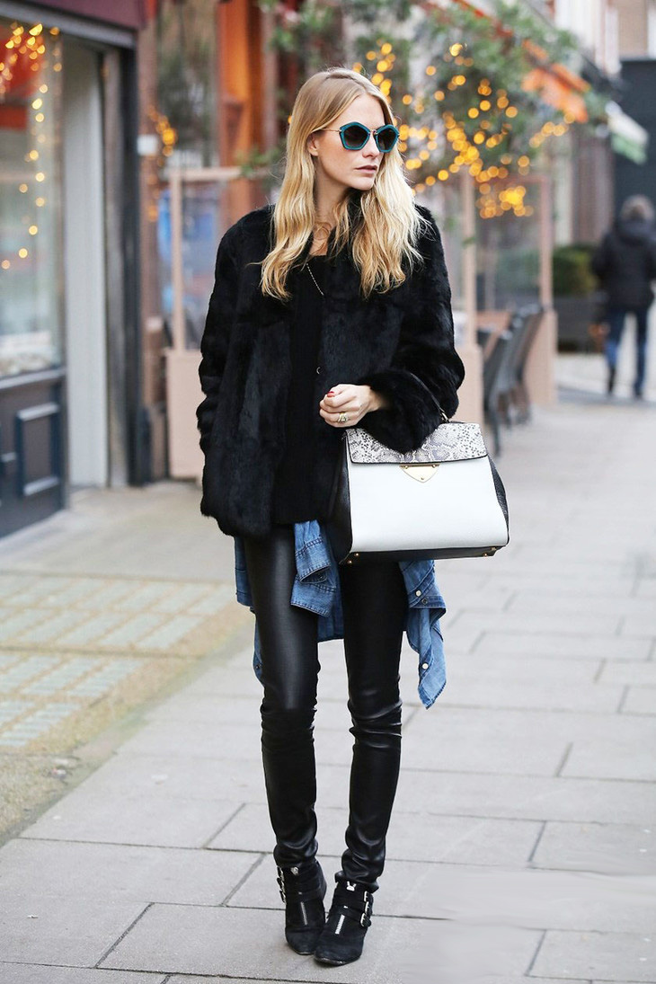 短靴搭配皮裤是惯用套路,中性且帅气。黑色的踝靴基本上是购买率最高的颜色,因为非常帅气且百搭,同色系的裤子这时候赶紧用起来,它会带来视觉的连贯性,让人觉得你腰以下全是腿。