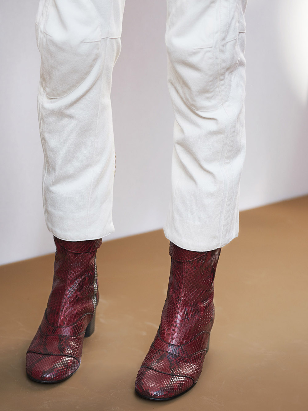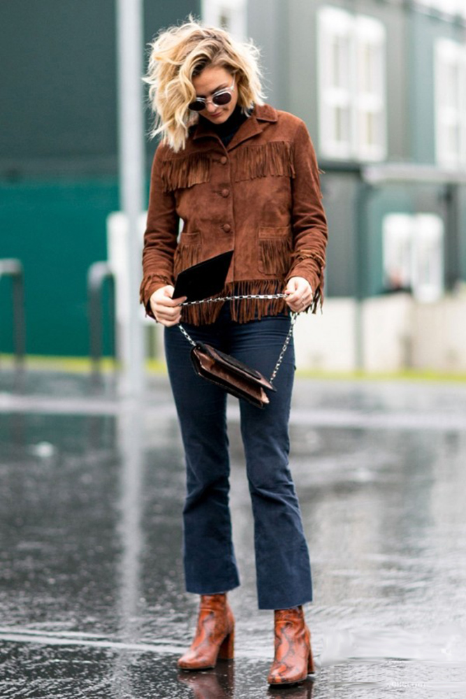 亮蛇皮的靴子几乎年年都有人穿,与前面不同的是,裤子也未必紧身才好,八分的微喇裤搭配短靴也是时下越来越多人会选择的穿搭方式之一,它很容易营造一种年代感,复古且时尚。