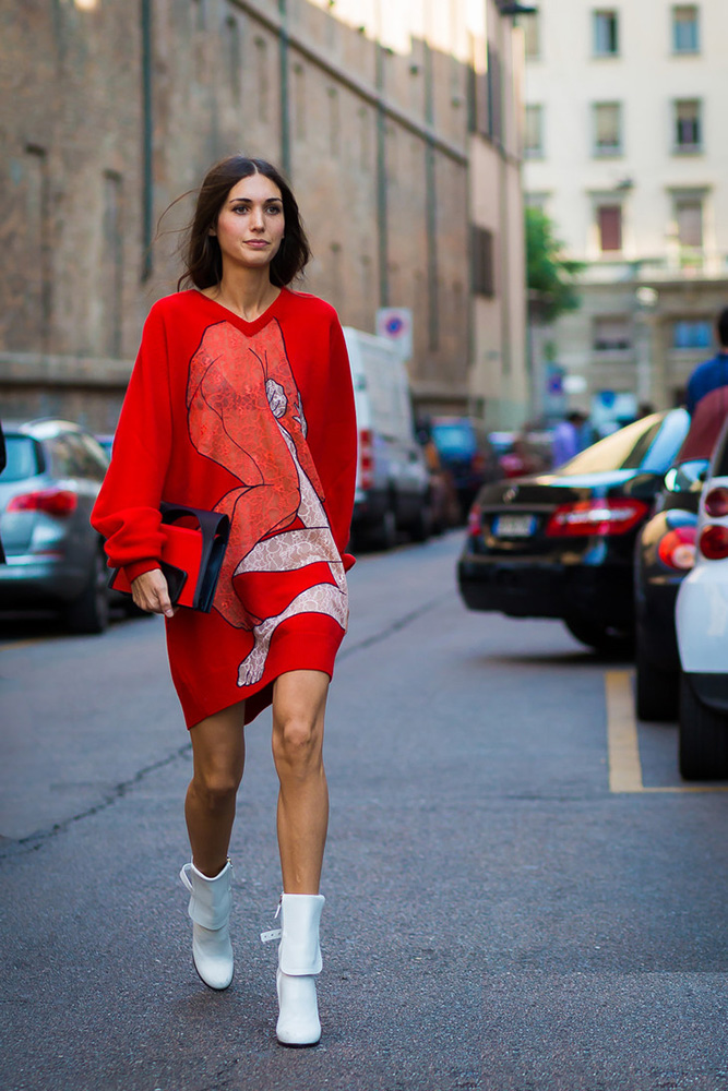 我们会发现几乎所有的时装发布会,或是时尚博主的街拍里,对于粗跟短靴的搭配总是遵守一个原则,就是“尽量全盖掉,要露只露一小截脚踝”。关于有些姑娘对粗跟会显得腿短的问题,这或许是最好的回答。