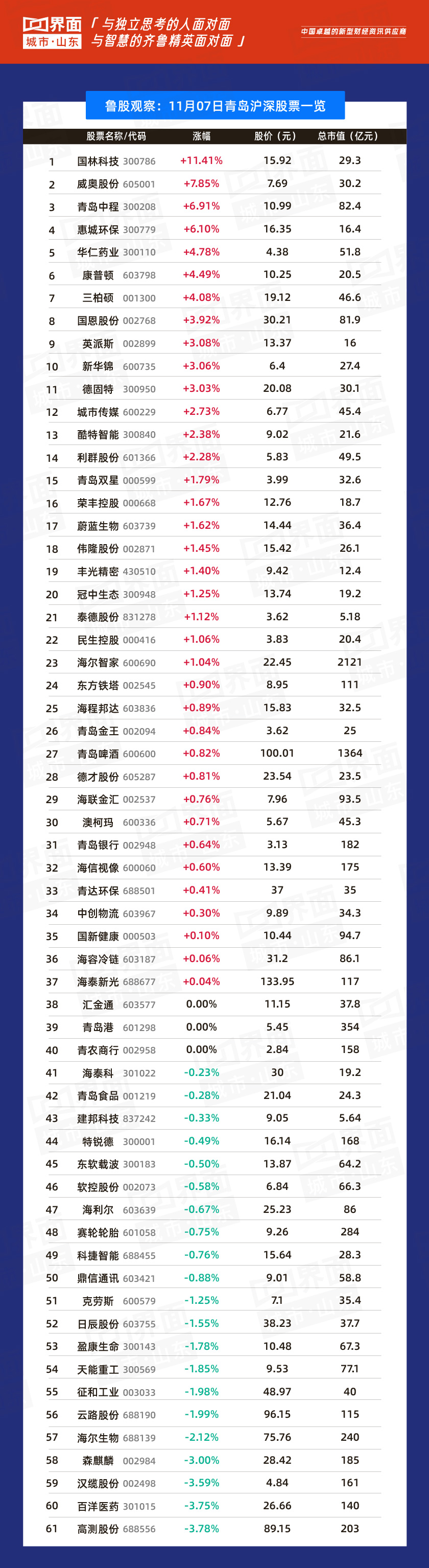 青岛市涨幅榜首:国林科技(300786),涨幅11.41%,股价15.92元,总市值29.3亿元;