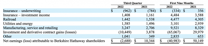 分业务来看,2022年三季度,伯克希尔保险投资收入为14.08亿美元,公用事业和能源业务的利润为15.85亿美元,均高于上年同期。然而,保险承保损失9.62亿美元,铁路业务收益从2021年的15.38亿美元下降到14.42亿美元。