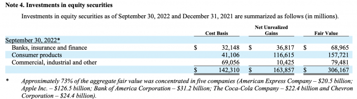 持仓方面,截至2022年9月30日,该公司股权证券投资的公允价值为3062亿美元,而截至2021年12月31日的公允价值为3507亿美元。