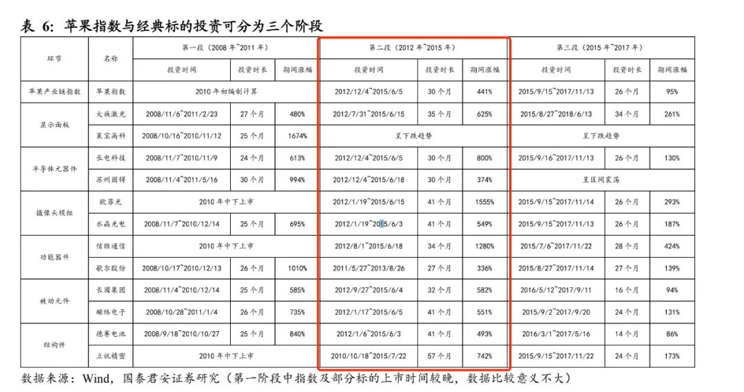 根据国泰君安统计,在2012至2015年,苹果产业链指数期间总体涨幅达到4.4倍。其中摄像头模组龙头欧菲光收入增长3.7倍、股价上涨15倍;射频器件龙头信维通信收入增长5倍、股价上涨12.8倍;连接器龙头立讯精密收入增长2倍,股价涨幅超7倍。