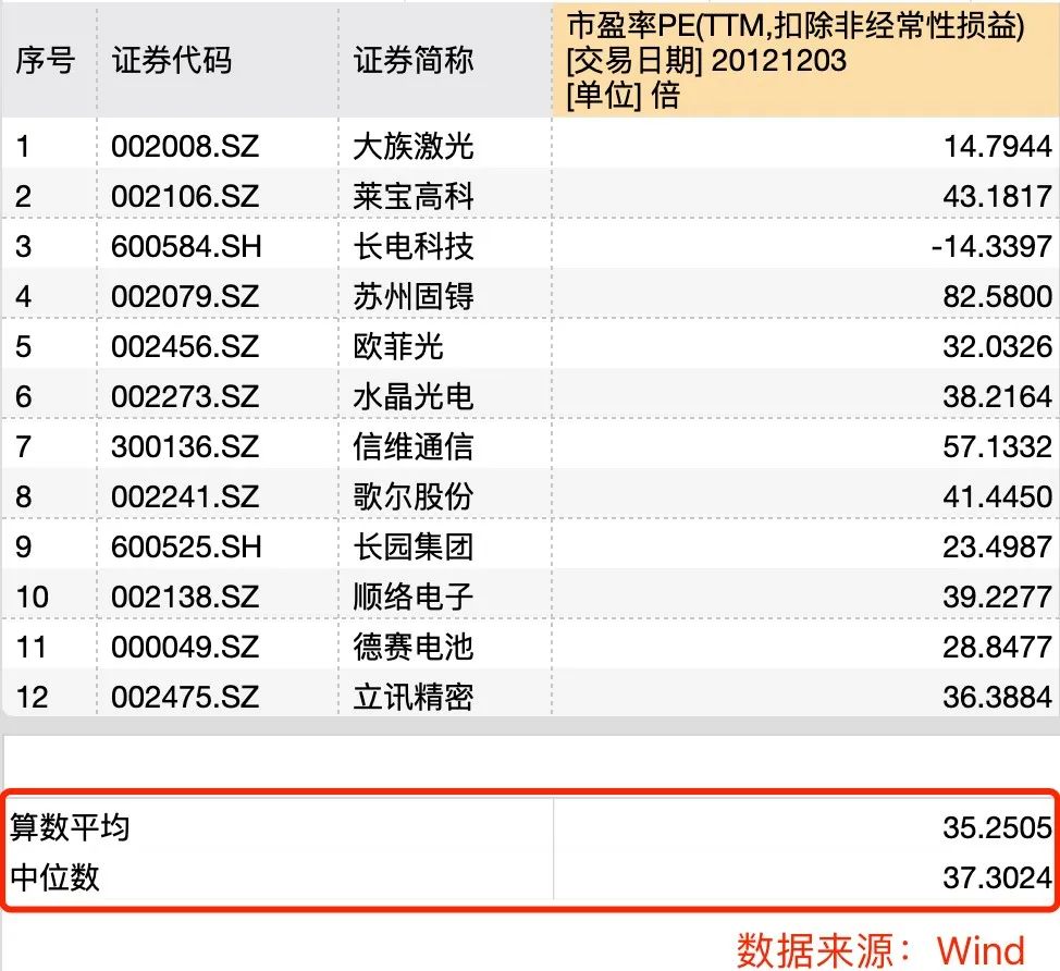2012年12月,智能手机核心公司的市盈率平均值和中位数已经回落到40倍以下。当时,市场已经经历了2010年11月开始的接近两年的熊市下跌,市场整体正逐步企稳。