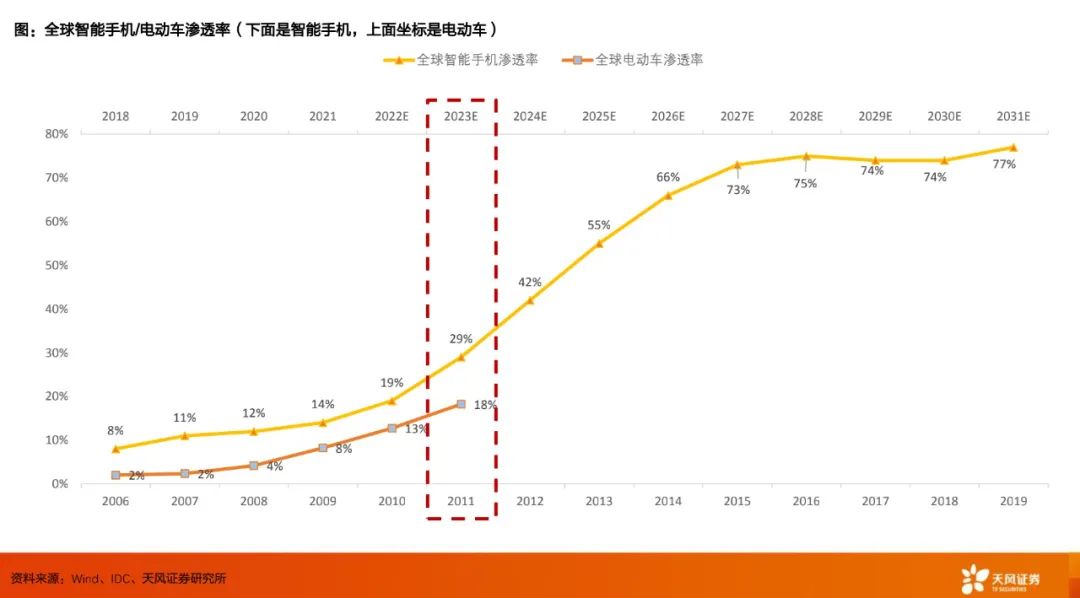 根据天风证券的预测,2023年全球电动汽车渗透率为18%,这和2011年全球智能手机渗透率29%相差不大。