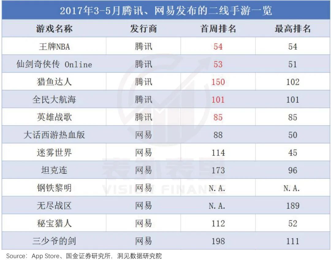 可以看到,新游不管是口碑产品,还是质量一般的二线作品,腾讯都有本事一开始就把它送到畅销榜前列。相比之下,网易的游戏通常首周排名很低,之后表现好才会慢慢爬坡。