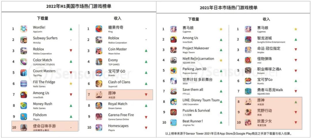 复盘一众出海游戏品类可以看到,风靡国内的《王者荣耀》《和平精英》等类型化游戏,在美日热门游戏榜上“查无此人”;而《原神》《荒野行动》等重风格化游戏,则表现突出。