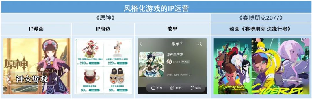 以《原神》和《赛博朋克2077》为例,在运营上,相比社交、赛事竞技,它们更强调IP生态的延伸。