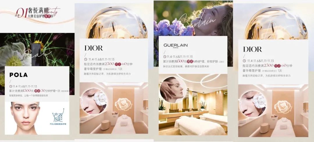 今年双11,龙湖北京长楹天街与几个美妆护肤品牌推出“奢悦满赠大牌美容护理免费享”活动,在POLA消费满1500元赠送30分钟护理一次,在娇兰消费满1500元可以享受MINI护理或彩妆护肤,在欧舒丹店内累计消费满500元赠送手部护理一次。