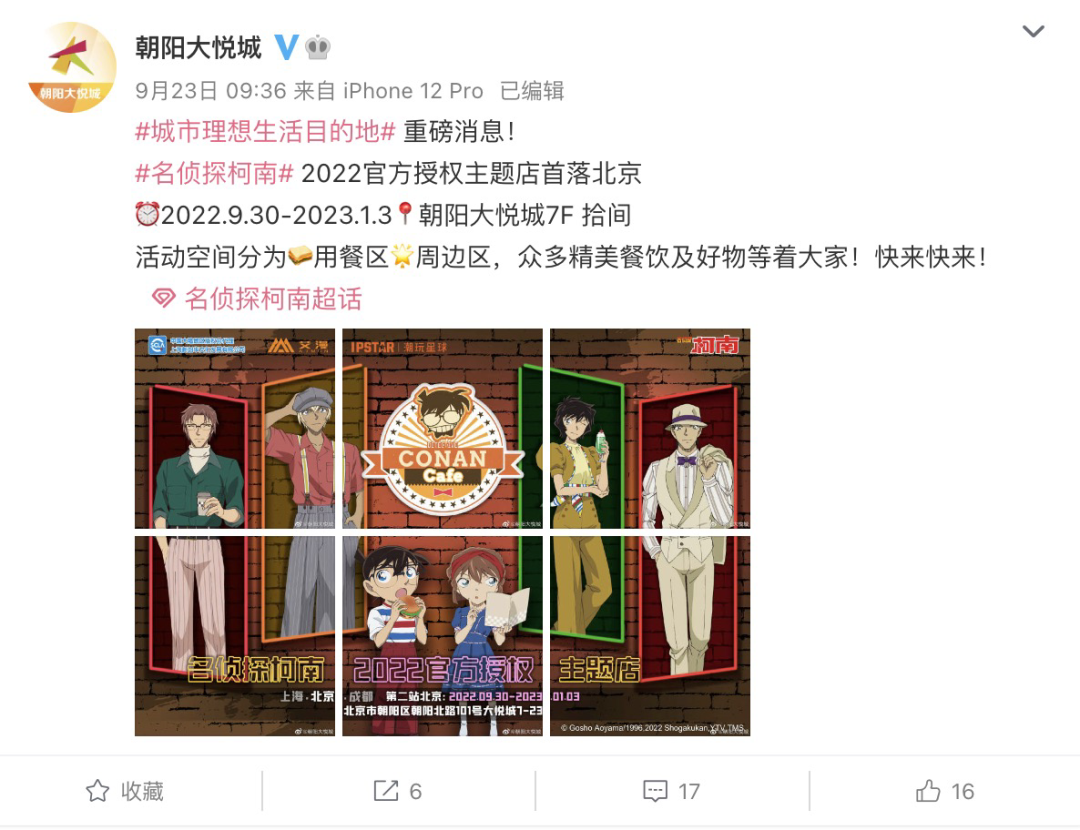朝阳大悦城即是典型案例,它转型时着眼于“青年消费文化”,自2015年以来接连建立“悦界”、“拾间”、“伍台”、“度刻”等不同定位的主题空间,并围绕主题引入相关的潮流业态,从而提高年轻人的购物体验。今年9月下旬,朝阳大悦城的“拾间”就引入了北京首家名侦探柯南官方授权主题店,该店为“餐饮+周边”复合业态,这类复合业态也是朝阳大悦城主题空间中典型的业态。