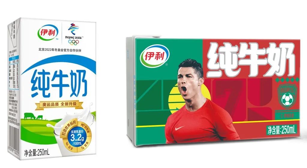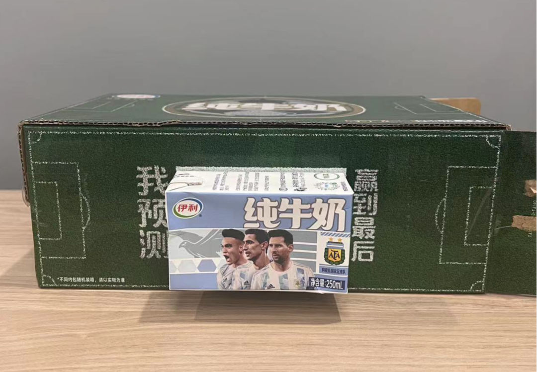 我们看到伊利在几天前推出了一个“梦之队限量装”纯牛奶。名字听上去挺普通,但它设计了一套“预测赢球”的玩法。把奶买回家之后,你可以直接把带有阿根廷队、西班牙队、C罗等球队和球星的包装放到外箱上拍照,晒出你pick的赢家。