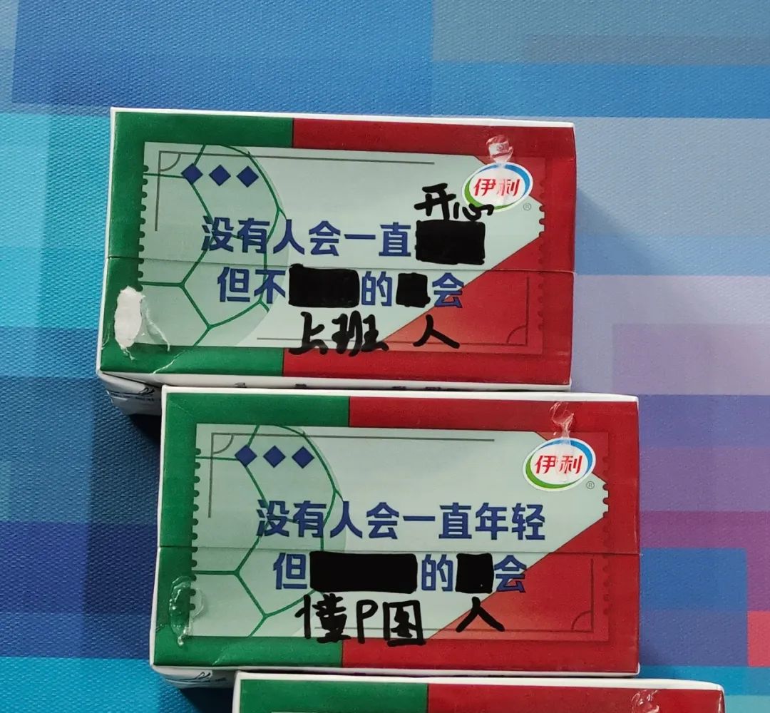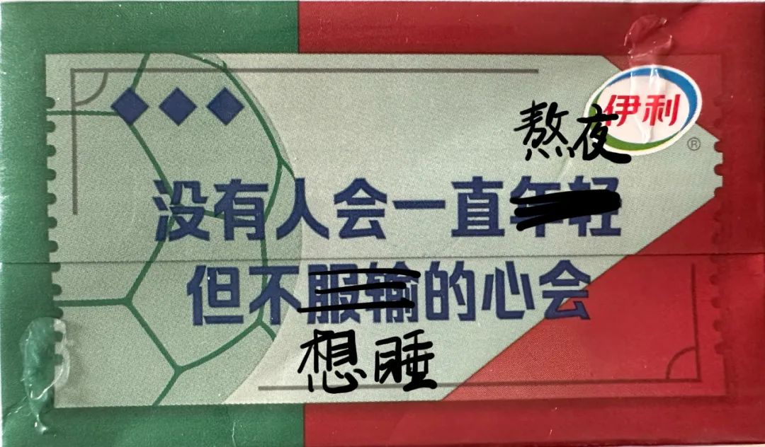 而在今年的足坛盛会开始前,伊利的限定装仿佛在包装设计的时候,就考虑到了社媒用户热爱恶搞、二创的属性。因为无论是正面人像还是背面标语,粉丝在当中都有很大的魔改空间。