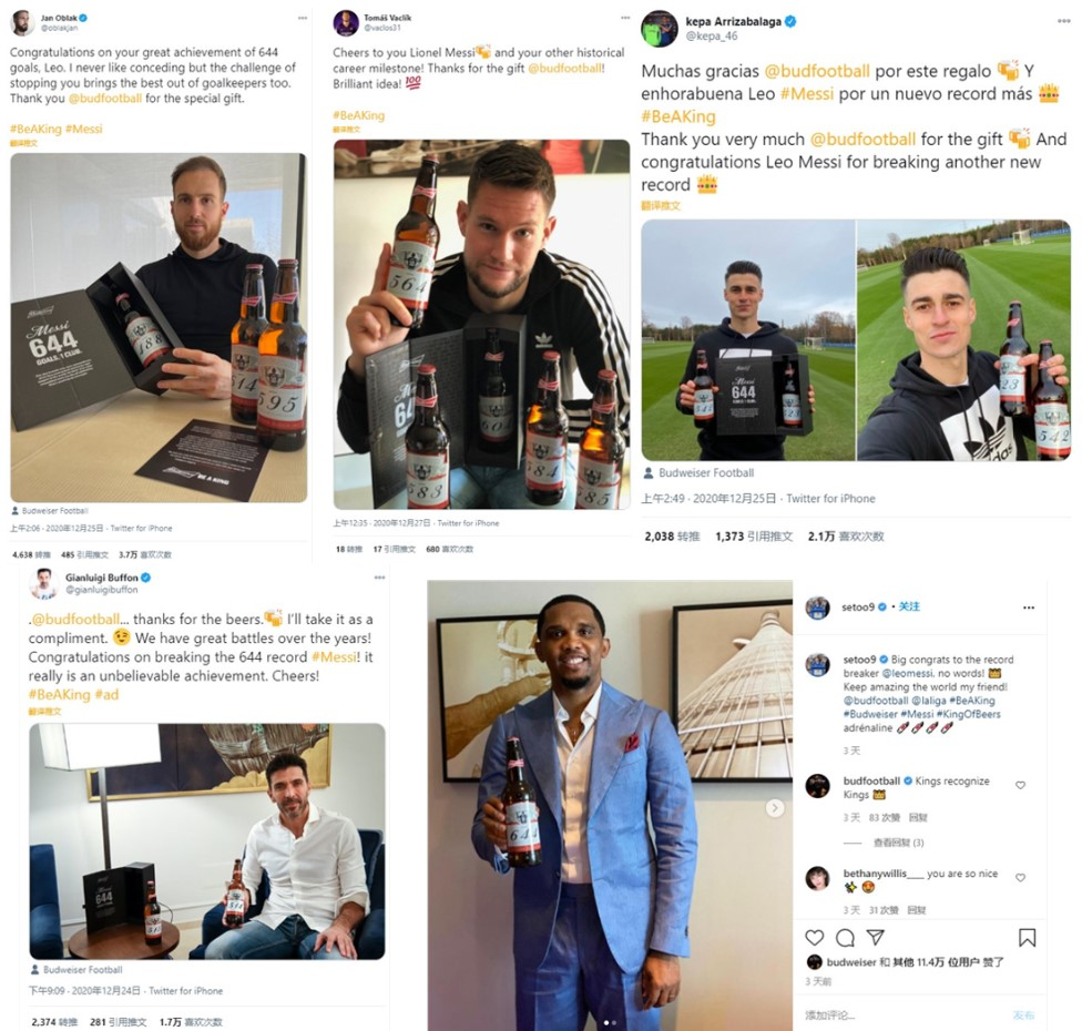 那年12月23日,西甲联赛第15轮比赛,梅西踢进了他为巴塞罗那队进的第644球,打破了上世纪贝利创下的“单一俱乐部进球数”世界纪录,而作为梅西商业伙伴的百威,马上很“损”地定制了644瓶啤酒送给被梅西进过球的160位门将。这个动作不仅获得了大量球星的传播,还在民间诞生了很多梗,在Twitter与Instagram上获得百万点赞与转发[5]。