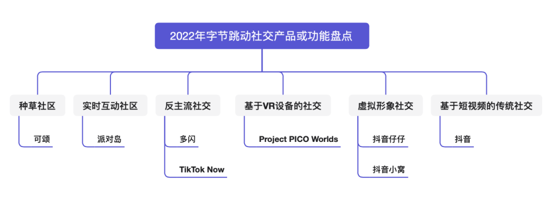 根据公开信息,Tech星球梳理了今年字节跳动推出的一些社交功能和产品,包括种草社区“可颂”(现已下线)、实时互动社区“派对岛”(现已下线)、反社交产品“多闪”和“TikTok Now”,基于VR设备的社交平台《Project PICO Worlds》,虚拟形象社交“抖音仔仔”和“抖音小窝”,以及一直在部分传统社交功能上更新的抖音APP本身。