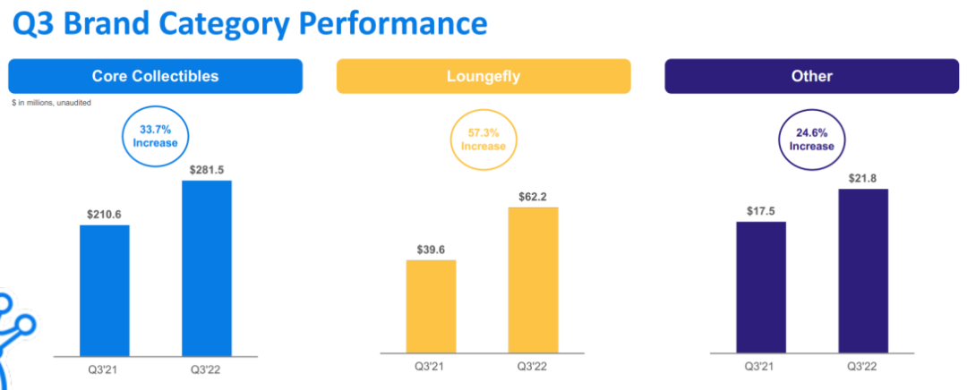 首先看看潮流玩具部门的情况。以Pop!系列玩偶为主要代表的核心收藏品销售在Q3仍然持续了稳定增长,净销售额为2.82亿美元,同比增长33.7%。