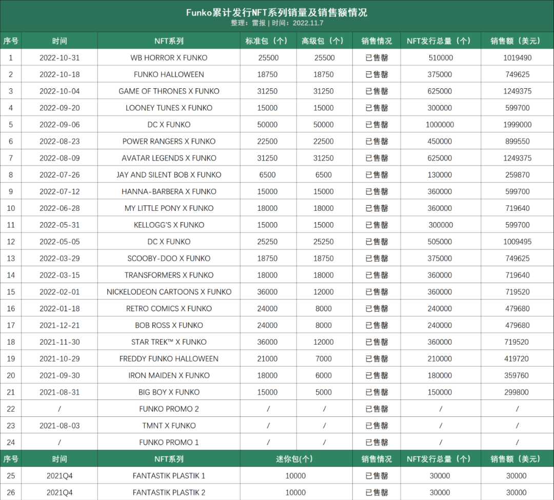 仅看2022年Q3,Funko的六款NFT产品累计发行量为189.75万个,共实现销售额560.7万美元,相比上一季度增长了140.7%。