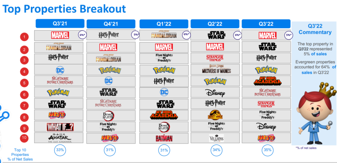 虽然财报所显示的业绩信息未能令市场满意,Funko手握的众多IP令其依然拥有未来发展的优势。2022年前三季度,Funko的活跃IP数量达到898个,其中单个IP的净销售额为110.2万美元,同比增长42.6%。近900个IP的授权构建了丰富多样的IP资源库,但其销售额主要还是由知名度较大的“常青IP”所支撑。
