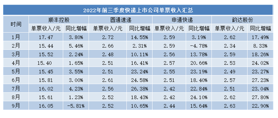 随着快递业价格战缓和,行业单票价格也较去年明显提升。经《每日财报》统计,今年前三个季度,A股快递上市公司整体单票收入均同比增长,4月至9月份增长幅度较为显著。