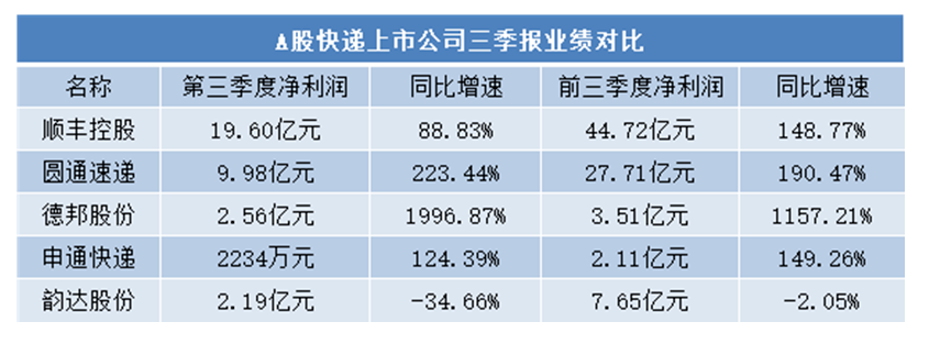 其中,快递业“一哥”顺丰控股主要面对高端订单,盈利能力更强,前三季度实现净利润为44.72亿元,比其余4家快递上市公司之和还多。德邦股份实现净利润扭亏为盈,前三季度净利润同比增长超过110倍,成为增速最快的企业。