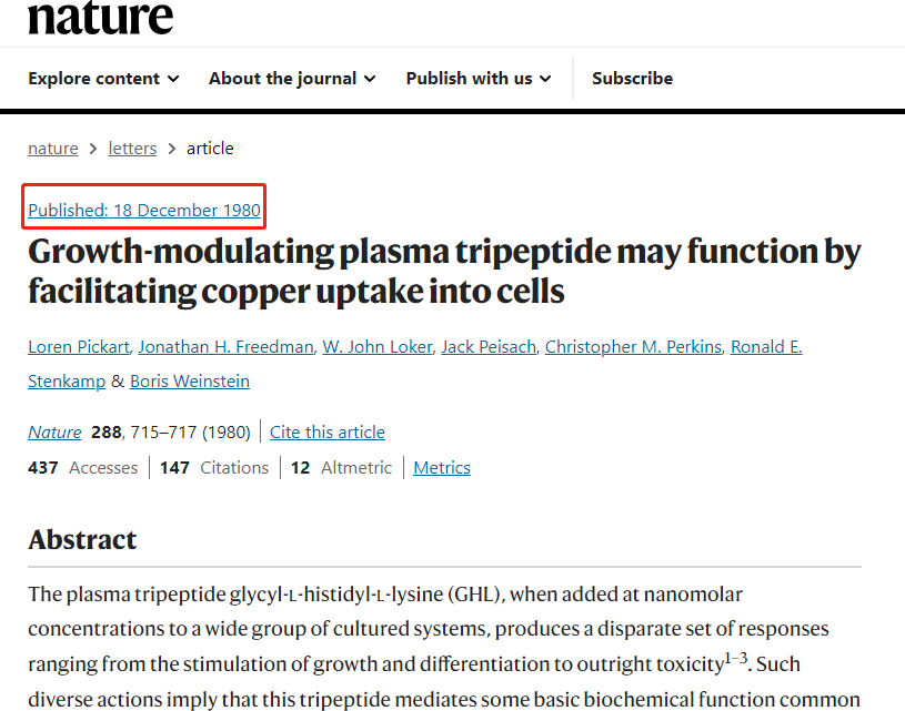 世界权威期刊《Nature》相关文献记载,1973年,蓝铜肽之父Loren Pickart罗伦·皮卡特从人体血浆蛋白中分离出三肽-1(蓝铜胜肽前身),并于1980年后正式发现蓝铜肽。而后,皮卡特博士创办了普罗塞特公司,正式将蓝铜肽投入商用。