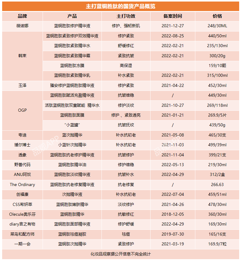 在Snowberry雪果之后,自2021年,大批国货陆续推出主打蓝铜胜肽的化妆品。据化妆品观察不完全统计,如薇诺娜、韩束、玉泽、OGP、瑷尔博士、野兽代码、AOEO、言之有物、菜鸟和配方师等都已推出相关产品。其中,如韩束、OGP更是重磅推出主打蓝铜肽的产品,并将该成分运用于护肤全品类。