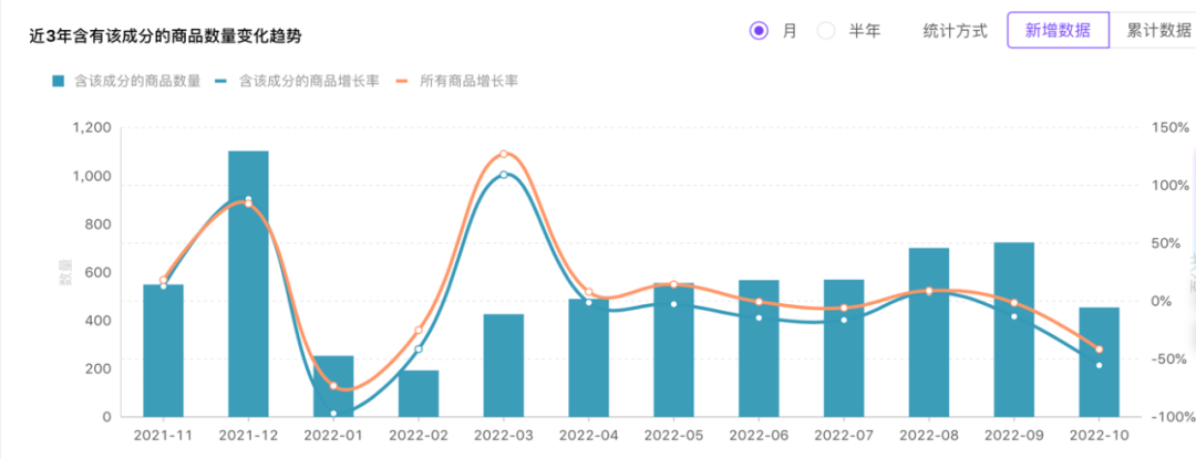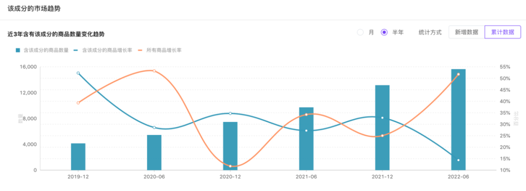 此外,据美丽修行大数据BEBD,2019年12月至2022年6月,含有蓝铜肽成分的产品数量不断上升,至2022年6月,含有该成分的商品(有效备案期内)数量同比增长60%。其中, 2021年12月,含该成分的商品环比增长100.73%。