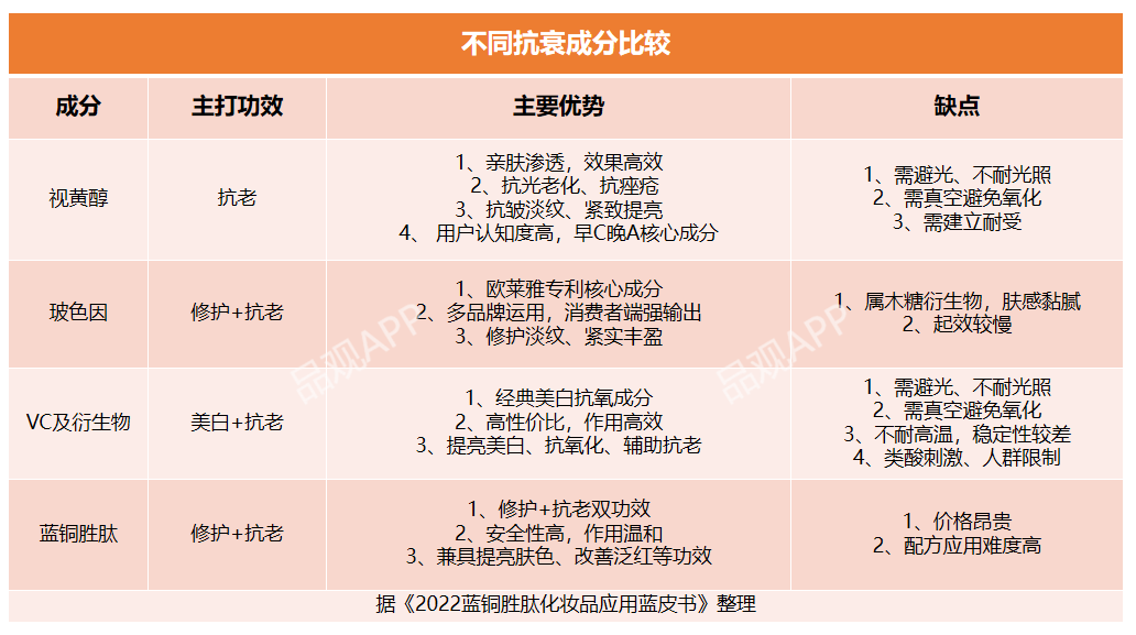 另一方面,通过特色成分破局。而目前,A醇、多肽类成分是众多品牌的发力重点。