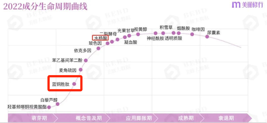 据美丽修行大数据BEBE,蓝铜胜肽还处于“概念普及期”