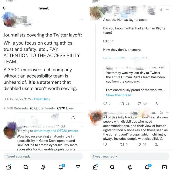 “记者们都在关注推特的裁员,当你们聚焦在伦理、信誉、安全等问题时,别忘了关注推特的无障碍部门。你能想象一家规模达3500位雇员的企业,没有无障碍部门吗?这样的公司根本不值得为之工作。”在推特上,有用户的推文如此写道。