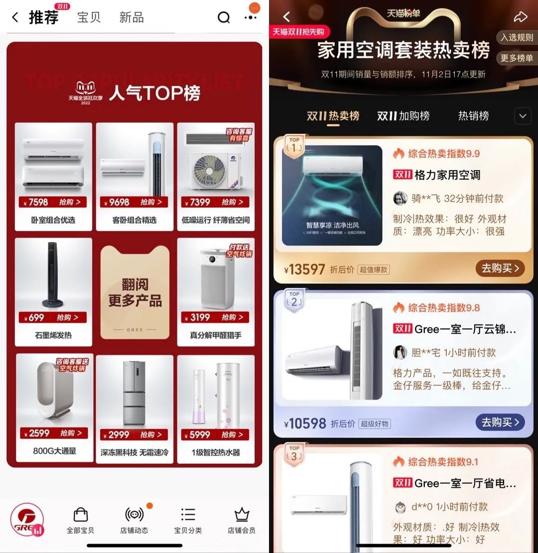以格力为例,在格力天猫官方旗舰店首页的人气TOP榜中,16款单品的价格在649-9999之间,售价最低的商品为649元的石墨烯折叠取暖器,而市面上普通取暖器的价格在200-400元不等。主力产品空调则强调UVC除菌、嵌入式、手机智控等技术优势,价位比店铺热卖的一款售价2899元(折后)的变频空调高出许多。此外,在截至11月2日16点更新的天猫双11家用空调套装热卖榜中,前四名被格力包揽,榜单TOP1为13597元的中高端挂机+柜机套装,页面显示已售空。除了格力,海尔旗下的高端子品牌卡萨帝在京东开抢1小时突破1亿元。此外,苏宁易购线下数据显示,双十一首轮爆发期,万元以上高端家电销售环比增长137%。高端产品的热销既是大家电巨头高端化战略的众望所归,也是家电消费需求从“功能”向“质能”转变的结果。