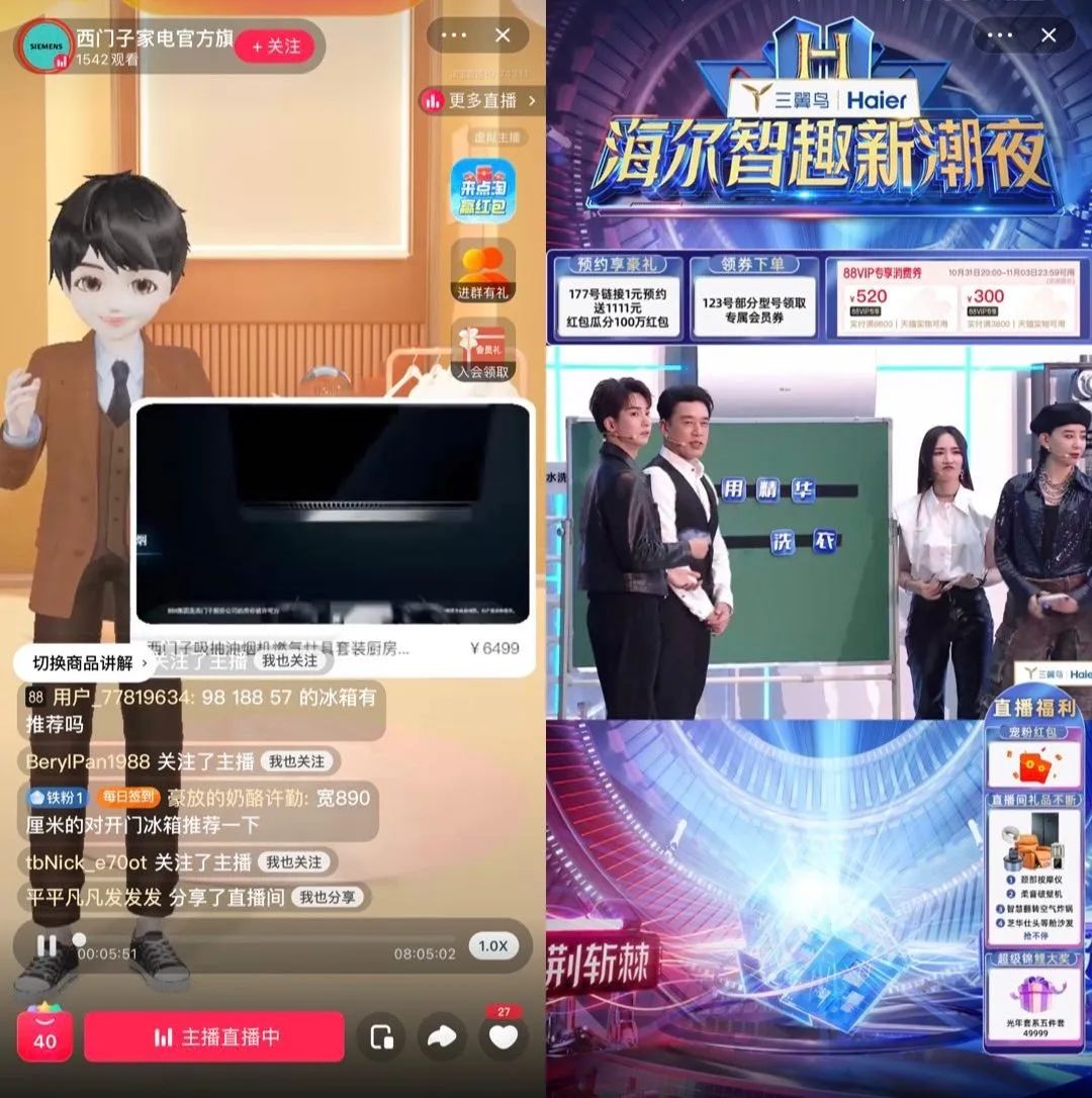 左图西门子AI虚拟人直播/右图海尔智趣新潮夜,图片来源:天猫截图