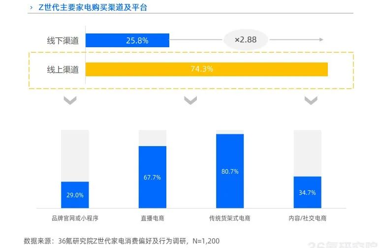 和美妆护肤、服饰食品行业的自播内容相比,家电品牌更注重专业知识的输出,无论是通过加长直播时长对产品功能进行滚动讲解,还是通过有意思的联动进行现场演示,都是为了让消费者对产品有更详细的认知。除了加码自播,家电品牌也在通过内容吸引流量,抢夺年轻用户的心智。随着90后和Z世代开始步入租房和买房阵营,线上平台成为他们获取家电产品信息、购买家电产品的主流阵地。根据《Z世代家电消费及内容兴趣报告》显示,74.3%的Z世代选择线上渠道,其中直播电商占比67.7%。