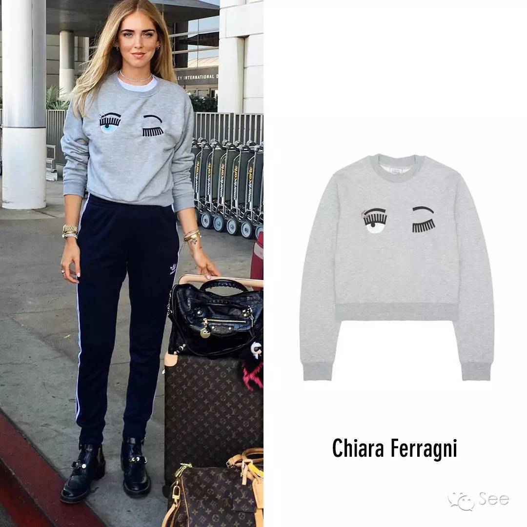 宇博Chiara最近穿自家品牌Chiara Ferragni的浅灰色卫衣。标志性的眨眼图案让人印象深刻。