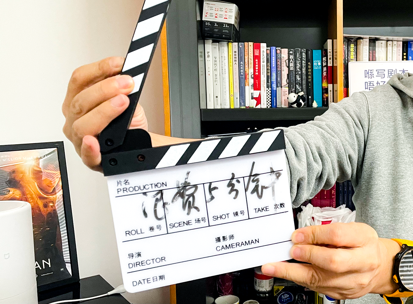 他的办公室布置也与网络形象相对应:电影、科幻、历史等书籍摆满书架,各式各样的的场记板至少有三个;笔记本电脑连接27寸的屏幕,上有屏幕挂灯,下摆机械键盘,桌搭简洁干净。