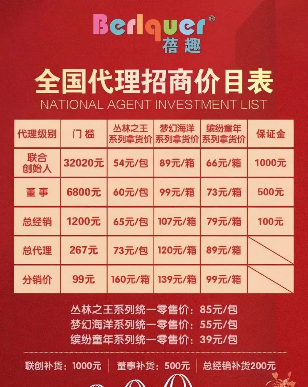 中国裁判文书网提到的蓓趣,大致与此相似。在其曾经披露的全国代理招商价目表中,设计了多个代理级别,甚至还有入门费、团队计酬等模式。