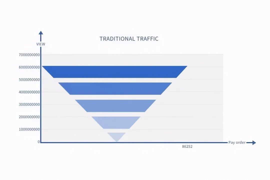 传统的流量模型,都是“倒三角”模型。大多是开一个流量入口,然后开屏页时流失一些,点错页面流失一些,对商品不感兴趣流失一些,填写地址流失一些,付款麻烦再流失一些……
