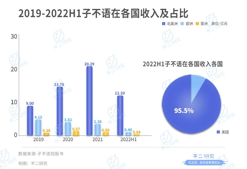 截止2022上半年,子不语在北美洲的收入占总收入的95.5%,其中美国占据95%;来自欧洲的收入占总收入的3.6%;而来自亚洲的仅有0.3%,可见其对于美国市场的偏爱,但另一方面也加剧了单一市场的“叛逆”风险。