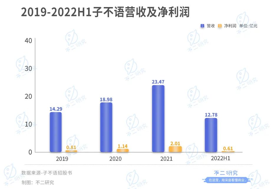 据招股书显示,2019-2022上半年,子不语营业收入分别为14.29亿、18.98亿、23.47亿和12.78亿。同期,净利润分别为0.81亿、1.14亿、2.01亿、0.61亿。