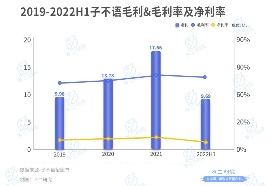 再看子不语的毛利,2019-2022上半年分别为9.98亿、13.78亿、17.66亿、9.69亿元,毛利率69.8%、72.6%、75.2%及75.0%。