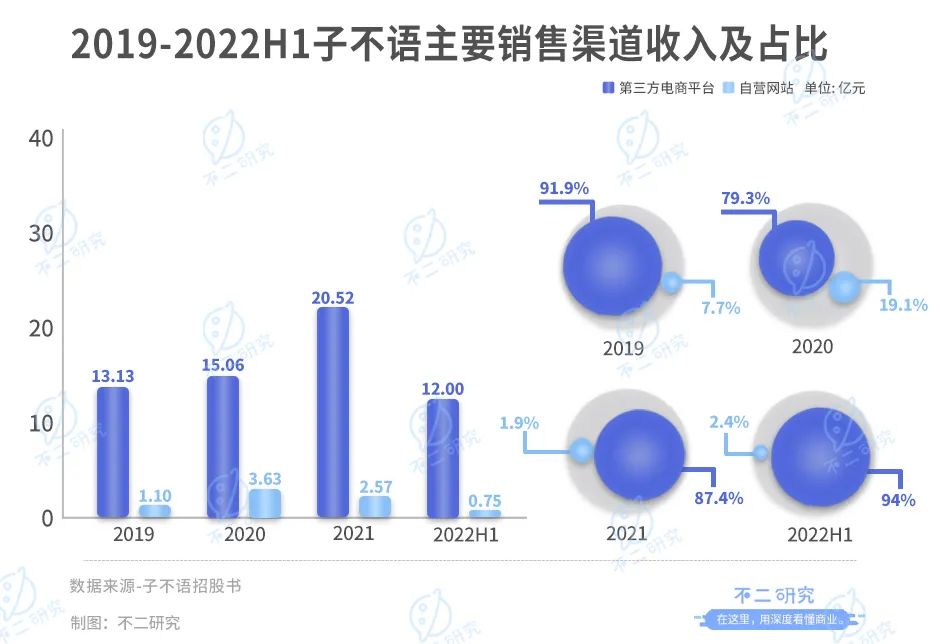 据子不语招股书显示,其收入来源按销售渠道划分,主要分为第三方电商平台和自营网站(以及其他)。2019-2022上半年,来自第三方电商平台的收入分别占比91.9%、79.3%、87.4%及94.0%。