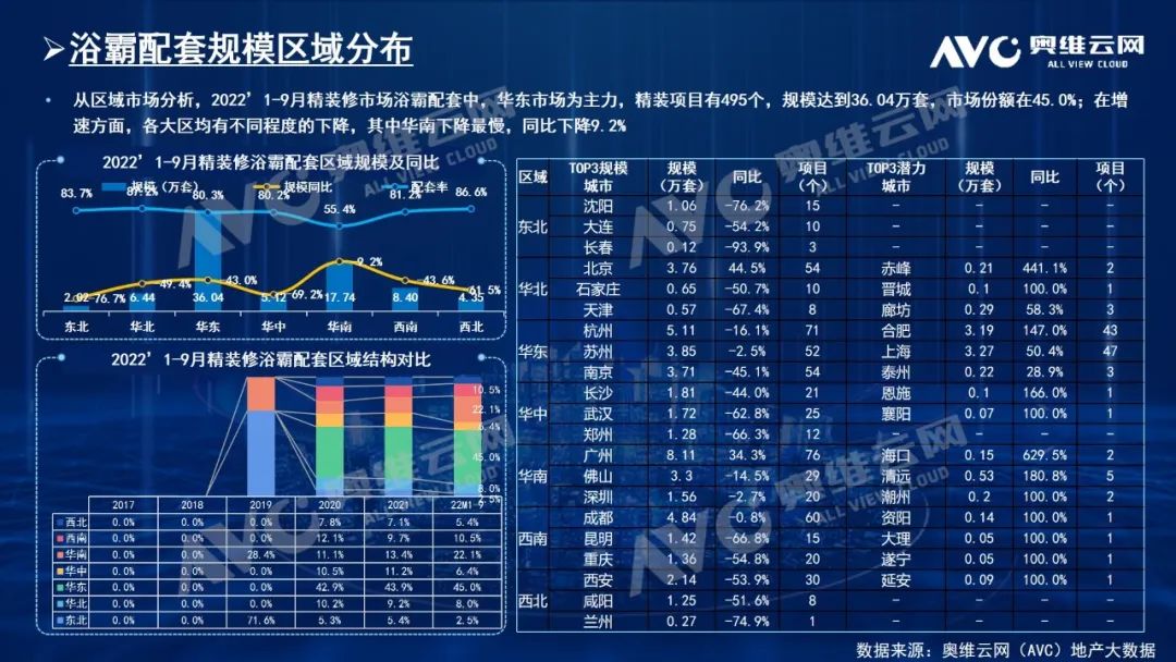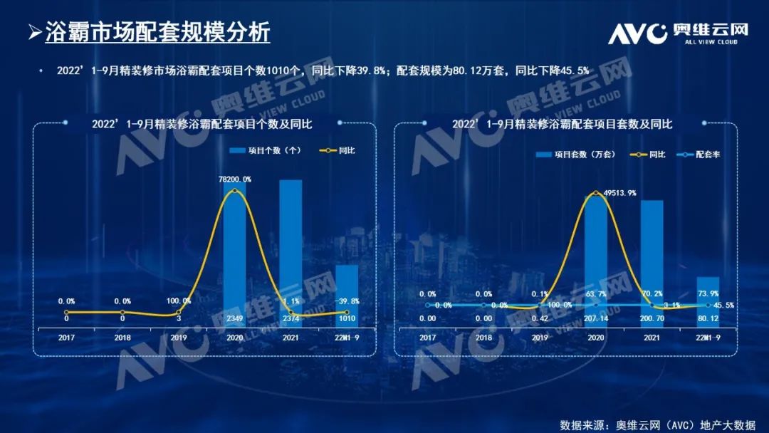 2021年以来,受市场需求不足,政策调整,疫情影响等原因,楼市开启了真正的“房住不炒”。奥维云网(AVC)数据监测显示,2022年1-9月房地产精装修市场新开盘项目1454个,同比下降39.0%;规模108.5万套,同比下降46.2%;其中9月新开盘精装项目198个,同比下降24.1%;规模13.9万套,同比下降33.7%,环比增长15.7个百分点;十一假期前夕中央及多个城市出台多条房地产利好政策,叠加售楼部优惠活动加持,10月精装楼市出现好转迹象,同时我们在数据监测中也发现10月份新开盘明显增多,市场呈现回暖趋势,四季度市场值得期待。浴霸是精装市场备受关注的家居产品,它在精装市场的表现如何呢?