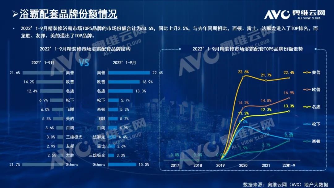 受大盘影响,浴霸配套规模有所下降,但其配置率呈现稳步增长态势;2022年1-9月精装修市场浴霸配套项目1010个,同比下降39.8%;规模80.1万套,同比下降45.5%;配置率逐年上升,达73.9%,除华南地区外,配置率均达80%以上,其中华北区域和西北区域配置率最高,分别达87.2%、86.6%。从品牌方面来看,2022年1-9月精装修浴霸市场TOP5品牌的市场份额合计为63.6%,同比增长2.5%,其中奥普作为浴霸行业的缔造者,持续保持TOP1地位,2022年1-9月市场份额22.4%,同比增长1.8个百分点;欧普、名族紧随其后,市场份额16.9%、13.3%,并且市场份额均有所增长。从品牌用户数量来看,奥普用户数量超百家,开发率达30%以上;西顿增长速度较快,同比增长80%以上。从开发商方面来看,万科、保利发展和中海地产的配套规模较多;华润置地逆势增上,配套规模2.7万套,同比增长5%左右。