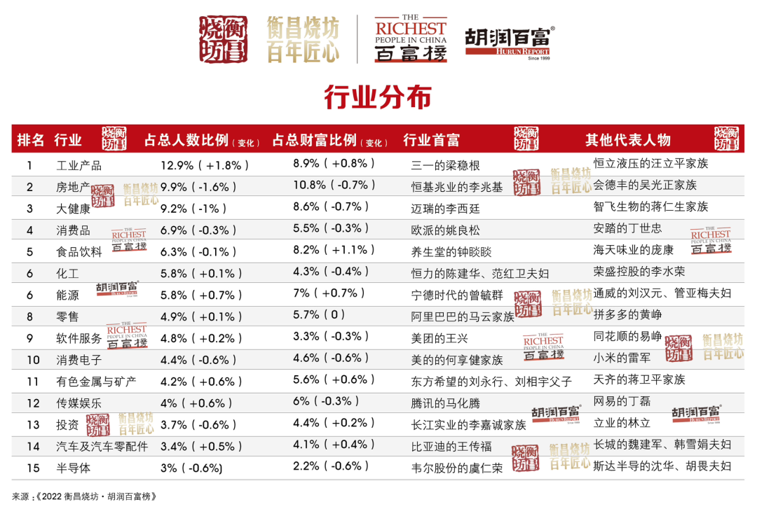 分行业看,据胡润研究所统计,工业产品行业的上榜人数居首位,占总人数12.9%,同比增长1.8%。其次是房地产和大健康行业,分别占比9.9%和9.2%。