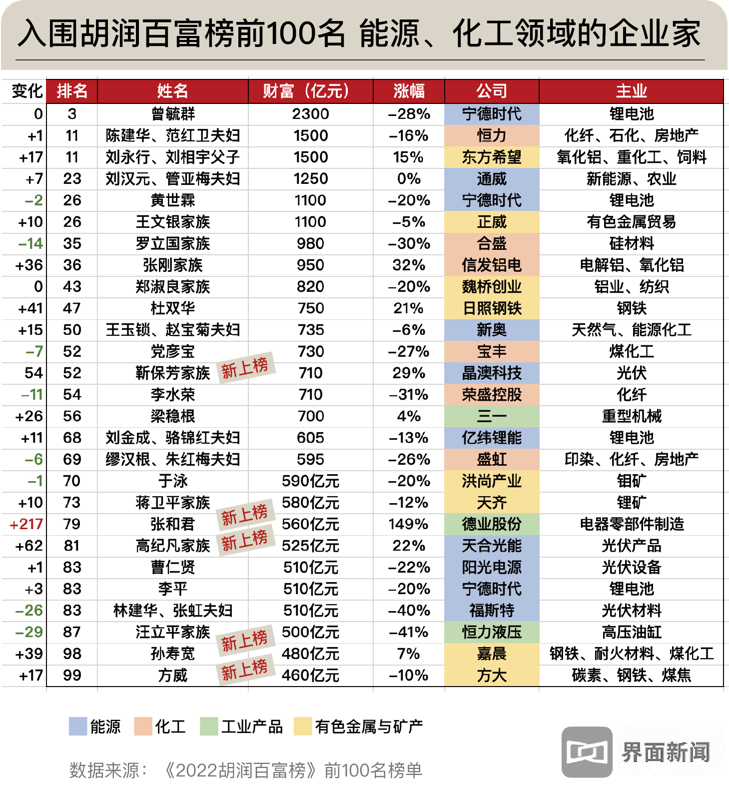 据界面新闻统计,在胡润富豪榜公布的前100名榜单中,工业、能源领域共入围34位企业家,来自25家企业,财富值在460亿-2300亿元之间。包括3家工业产品企业,6家化工企业,8家能源企业,以及8家从事有色金属与矿产的企业。