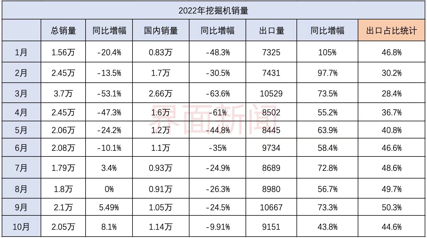 综合看,1-10月,26家主要挖掘机制造企业共销售挖掘机22.08万台,同比下降26%;其中国内13.1万台,同比下降46.4%;出口8.9万台,同比增长67.3%。