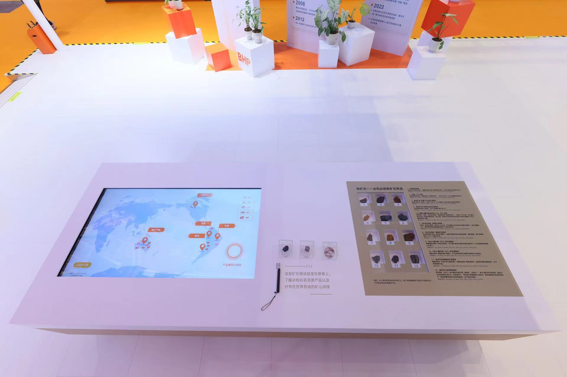 必和必拓展台以“面向未来,明朗可期”为主题,以白色和木质颜色为主,使用了品牌橙色为主基调,展台中间设置了一个互动感应桌面,选取矿石模块放置在屏幕上,便可了解必和必拓资源产品,以及分布在世界各地的矿山详情。