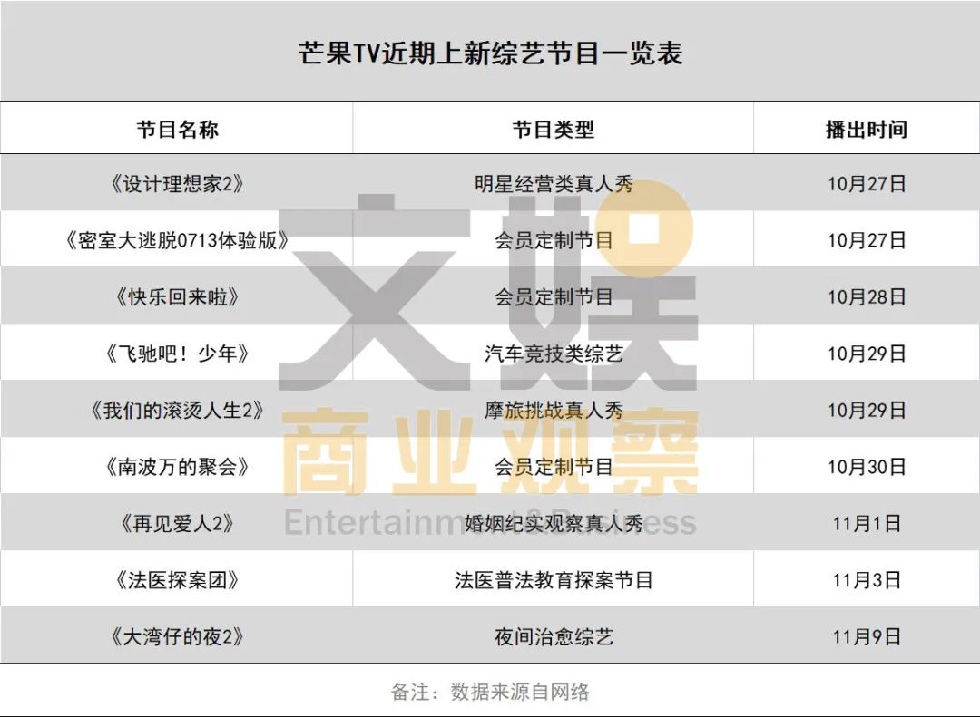 据文娱商业观察统计,从10月下旬到11月上旬,芒果TV累计上线九档综艺节目,基本上频率达到了两天左右就有一档节目与观众见面,不愧为“综艺航母”。