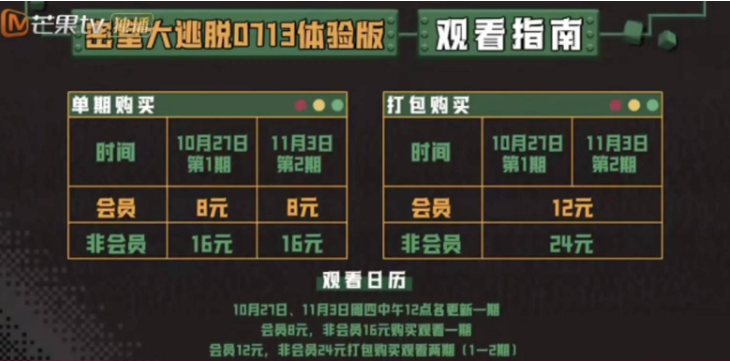 《密室大逃脱》第四季在10月初便已经收官,但是近期,节目组又推出了会员定制节目《0713体验版》,在平台上实行单片付费模式,非会员单集16元,双集24元,会员单集8元,双集12元。